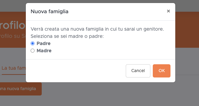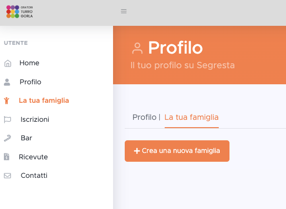Una volta entrati nell'area personale, dalla sezione Profilo è possibile selezionare la voce "La mia famiglia" e cliccare sul pulsante "Crea una nuova famiglia".