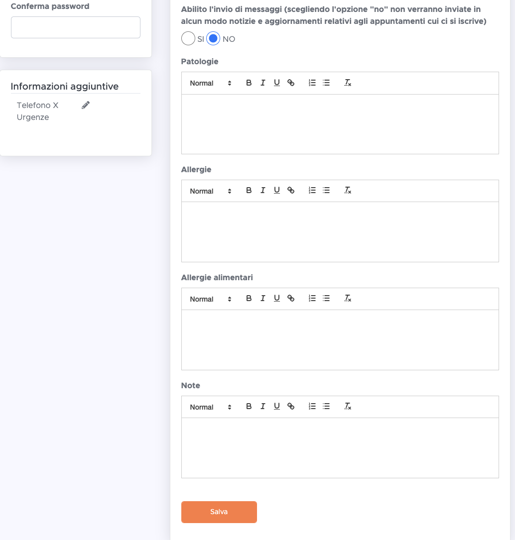 Nei profili di ogni figlio/a, chiediamo di inserire eventuali patologie, intolleranze, note riservate nonché un numero di telefono di emergenza se i recapiti dei genitori non fossero raggiungibili. Anche caricare una foto può essere utile alla segreteria per l'identificazione del minore, con la certezza che tutti i vostri dati sono al sicuro e non vengono mai resi pubblici.